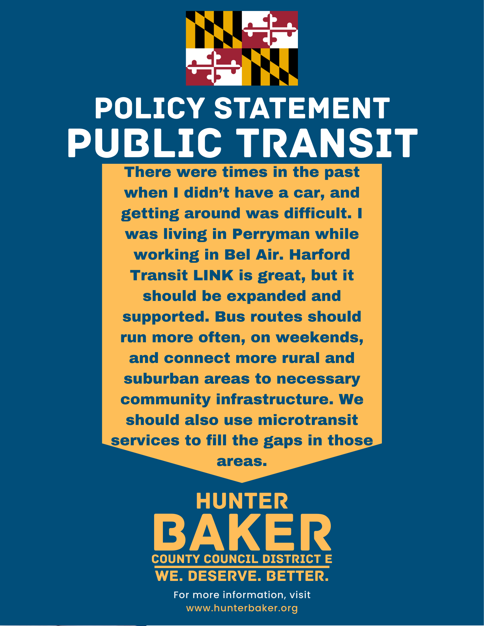 Harford residents need better options to get to work, school, and appointments. I will push to add more buses, extend routes deeper into residential areas, and add later evening and weekend service so transportation works for everyone, not just during weekday rush hours.